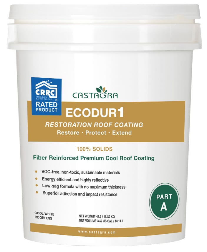 Ecodur1 Cool Roof Coating from Castagra is a fiber-reinforced premium cool roof coating with superior adhesion and impact resistance. With no maximum thickness and a low-sag formula, Ecodur1 is a one-coat solution on most substrates, generally requiring no base or topcoat. Ecodur1 is also odorless, 100% solids, and has lifetime repairability. Ecodur1 is energy efficient and highly reflective, meeting the requirements of California Energy Commission (CEC) Title 24, and is listed by the CRRC. Ecodur1 is VOC-free, non-toxic and made of sustainable materials, making it the environmentally friendly choice as well as the top performing.